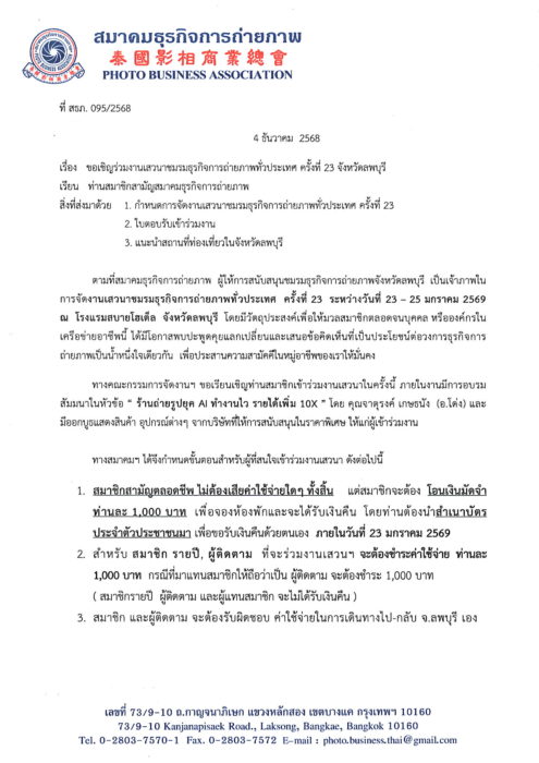 ข่าวสารสมาคม ขอเชิญสมาชิกเข้าร่วมงานเสวนาชมรมธุรกิจการถ่ายภาพทั่วประเทศ ครั้งที่ 23 จังหวัดลพบุรี 4/12/20254/12/2025 admin EPSON MFP image EPSON MFP image Related Posts ข่าวสารสมาคม โครงการมอบรางวัลการศึกษาแก่บุตรของสมาชิกสามัญของสมาคมฯ ประจำปีการศึกษา 2567 5/09/20255/09/2025 admin ข่าวสารสมาคม การอบรมหลักสูตรออนไลน์ หัวข้อ การใช้ PHOTOSHOP 2025 ,CANVA /GENERATIVE AI รุ่นที่ 1 6/08/202528/08/2025 admin